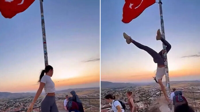 Una turista extranjera enfrenta problemas legales en Turquía tras hacerse viral un video en el que aparece realizando movimientos de baile en barra de tipo sensual, también conocido como ‘pole-dancing’, en el mástil de una bandera turca en el castillo de Uchisar, en la región de Capadocia, informan medios locales.