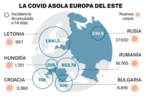 Rumanía, Lituania, Letonia, Bulgaria, Croacia, Ucrania… En todos los países del este de Europa han saltado las alarmas. ¿Su punto en común? El amplio rechazo de la población a vacunarse, incluso entre los colectivos más vulnerables. En Rumanía, solo un 30% de la población tiene la pauta completa y, en Bulgaria, más del 75% de los 6,9 millones de habitantes no se ha puesto ni una sola dosis, según los datos oficiales. Por debajo del 30% se encuentran también Moldavia y Ucrania.