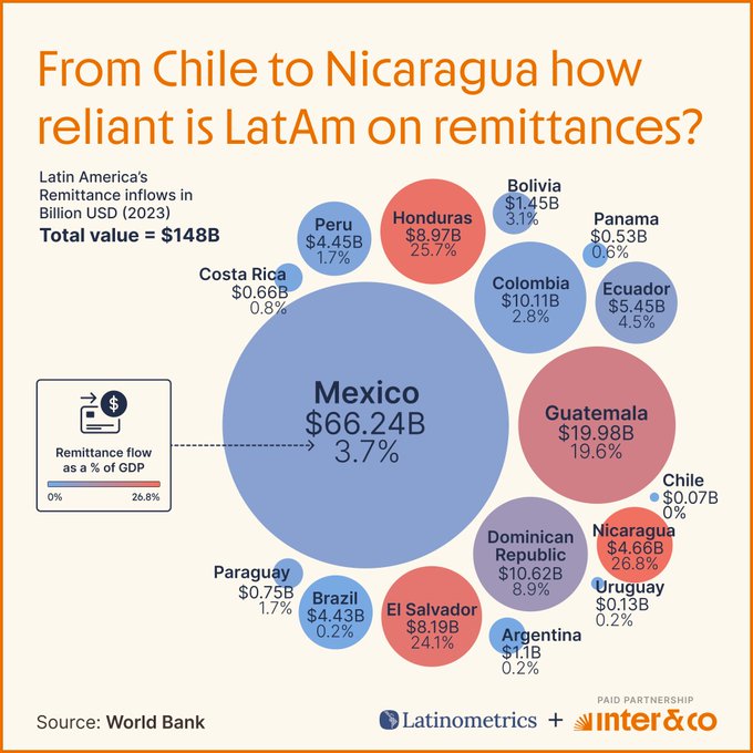 No es para menos. De acuerdo con datos compilados por Bloomberg a partir de cifras publicadas por el Banco Mundial, las remesas representan para Honduras y El Salvador el 21 % de su PIB, mientras que en Guatemala ascienden a 17 %. En otras naciones, como República Dominicana y México, también se aprecian montos relevantes: 7 % y 4 %, respectivamente.