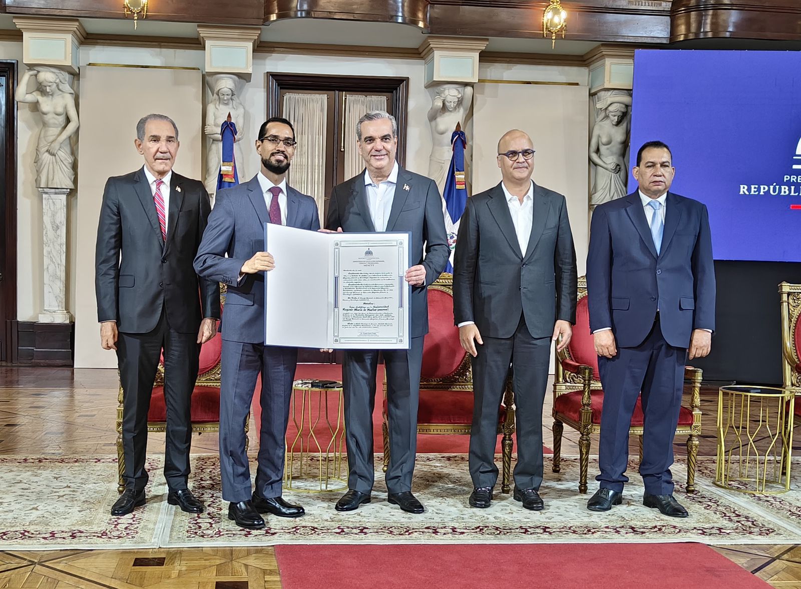 En un evento celebrado en el Palacio Nacional, el rector de UNIREMHOS , Wady Ramírez, recibió la certificación de manos del presidente de la República, Luis Abinader y el ministro de Educación Superior, Ciencia y Tecnología, Franklin Garcia Fermín.