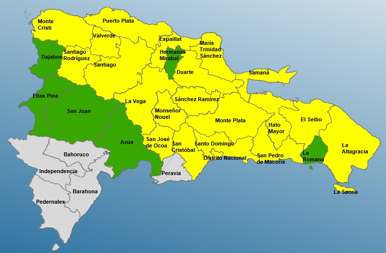 Las demarcaciones en alerta amarilla son: María Trinidad Sánchez; San José de Ocoa; Espaillat; La Altagracia; Sánchez Ramírez; La Vega; Monseñor Nouel; Monte Plata; Santiago; Montecristi; Puerto Plata; Samaná; San Pedro de Macorís; San Cristóbal; El Seibo; Santiago Rodríguez; Hato Mayor; Valverde; Santo Domingo; Distrito Nacional, y Duarte. En verde están: Elías Piña; La Romana; Dajabón; Azua; San Juan, y Hermanas Mirabal.