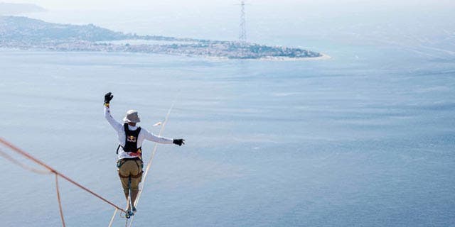 El atleta recorrió 3,600 metros sobre una cuerda floja a 200 metros de altura del mar entre el poste de Villa San Giovanni, en la región de Calabria (la punta de la bota italiana) y el de Messina, en territorio siciliano.