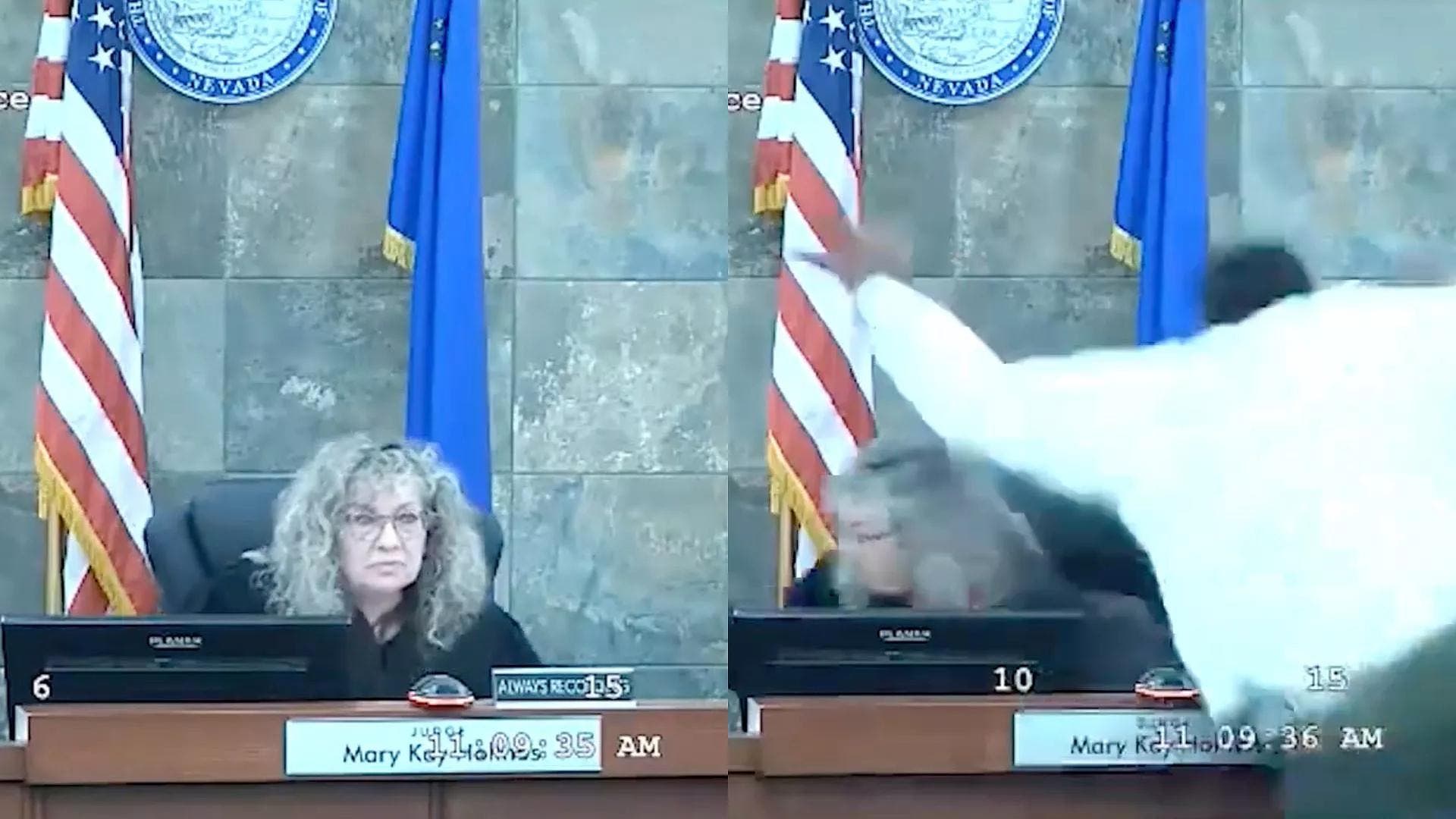 Un hombre atacó a una jueza en Las Vegas en su sala del tribunal este miércoles, forzándola a resguardarse y causando lesiones a un alguacil, según se puede observar en un video de la audiencia.